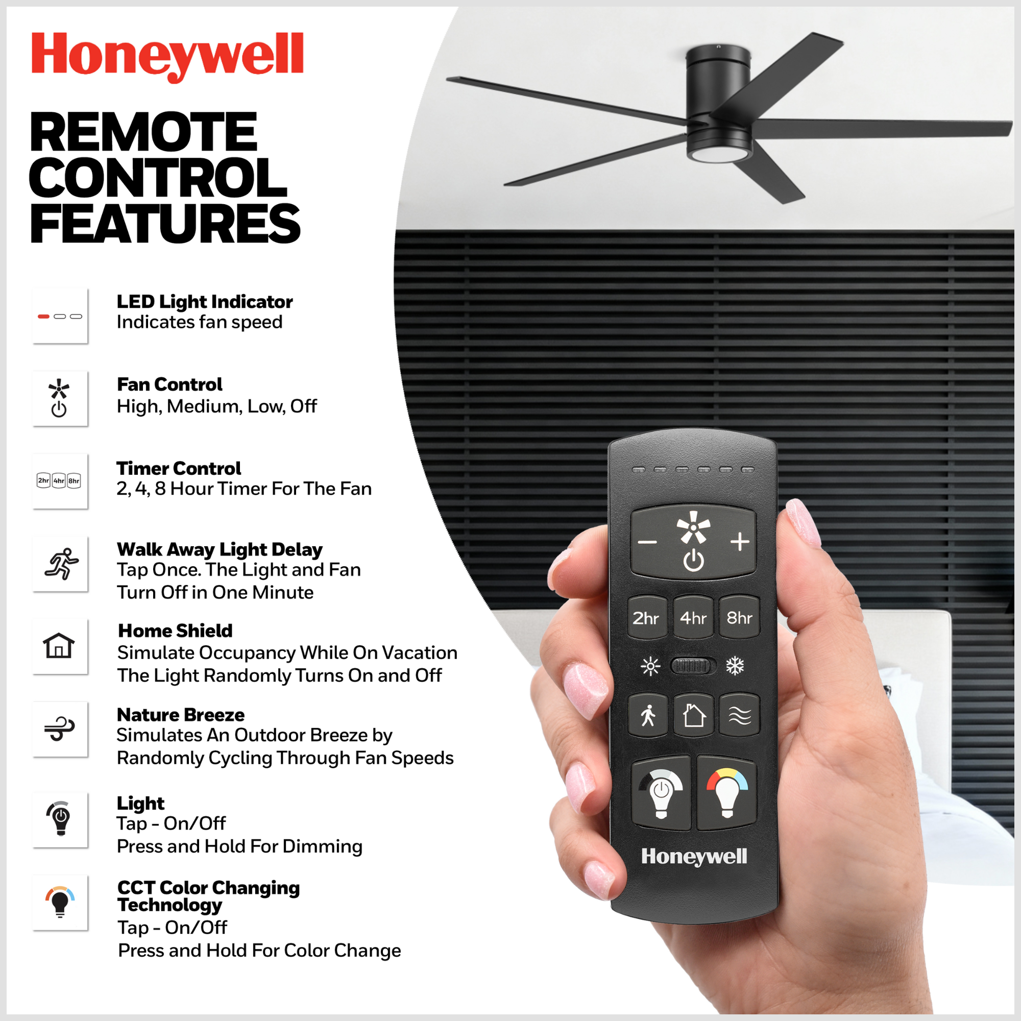 - Control your Honeywell ceiling fan with the touch of a button with our easy-to-use universal ceiling fan remote control with wall mount option (batteries included).
